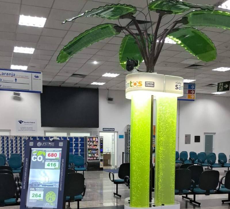 A Árvore Líquida, também conhecida como ‘Life Tree’, é um fotobiorreator que utiliza microalgas para realizar fotossíntese, capturando dióxido de carbono (CO2) e liberando oxigênio no ambiente.