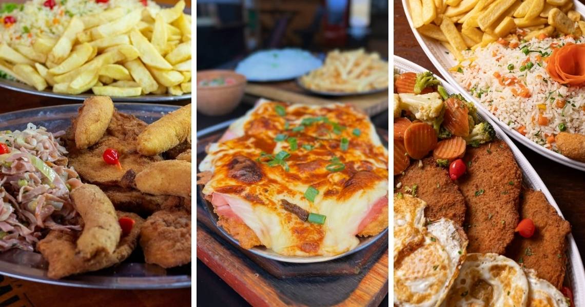 Entre as opções estão os escondidinhos de carne seca e bacalhau, os espetinhos mistos e à cubana, disponível com frango, contrafilé ou mignon, acompanhado de arroz à grega, fritas, presunto, ervilha, cebola na manteiga, banana e abacaxi à milanesa.