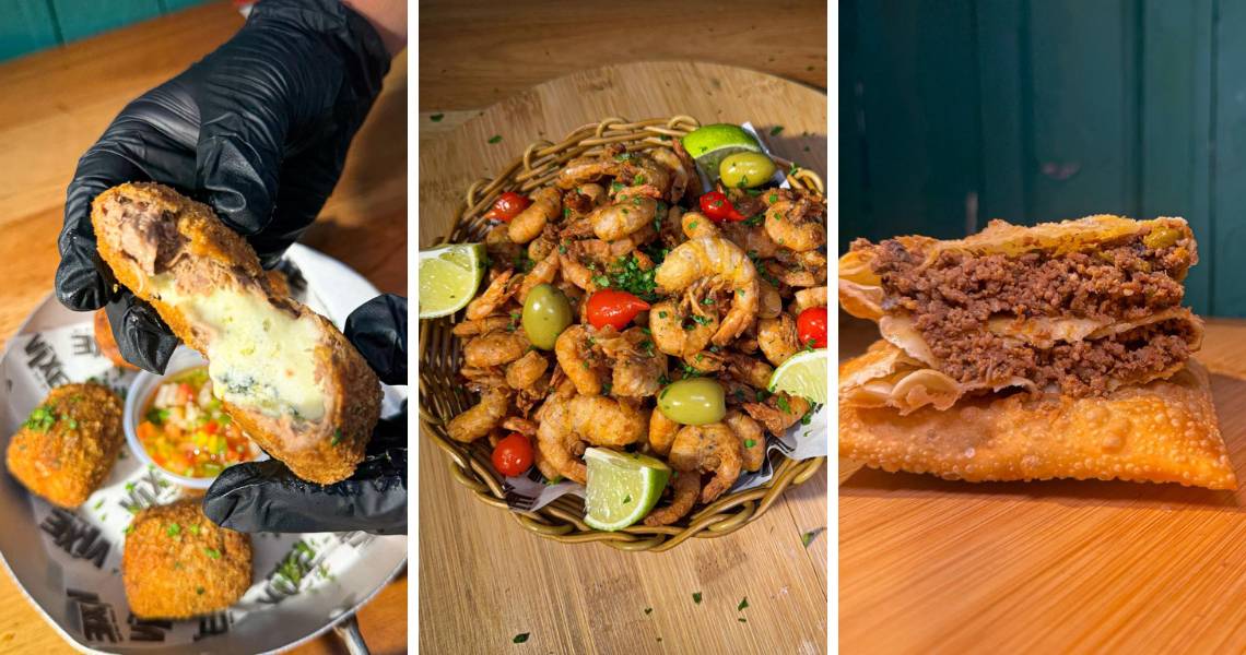 Entre os destaques do cardápio estão o bolinho de baião de dois recheado com carne seca, bacon e queijo coalho, bolinho de carne com gorgonzola e bolinho de abóbora com camarão. Também entram na sequência clássicos como pastel de carne, camarão à dorê, calabresa acebolada, coração de galinha e baby beef em tiras, além de acompanhamentos como batata frita, mandioca e versões com cupim e catupiry.