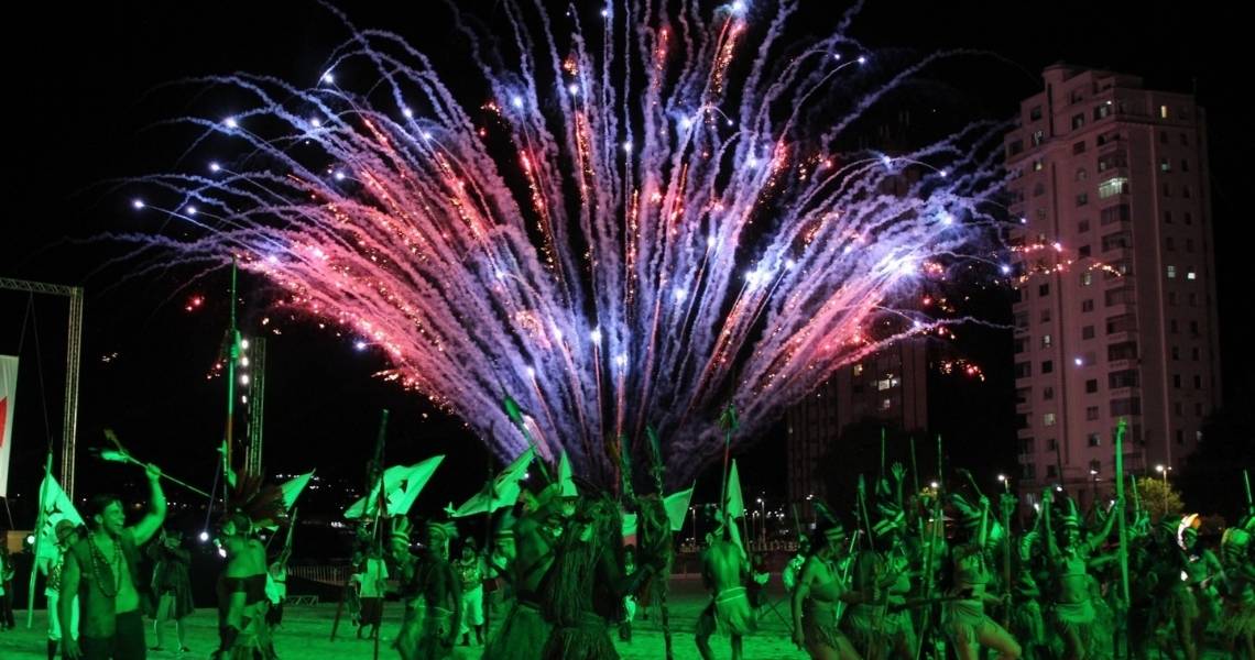 Em 2026, o espetáculo chega com o tema ‘O Chamado dos Elementos’, explorando água, fogo, terra e ar como símbolos da relação entre portugueses e povos originários no processo de nascimento da cidade.
